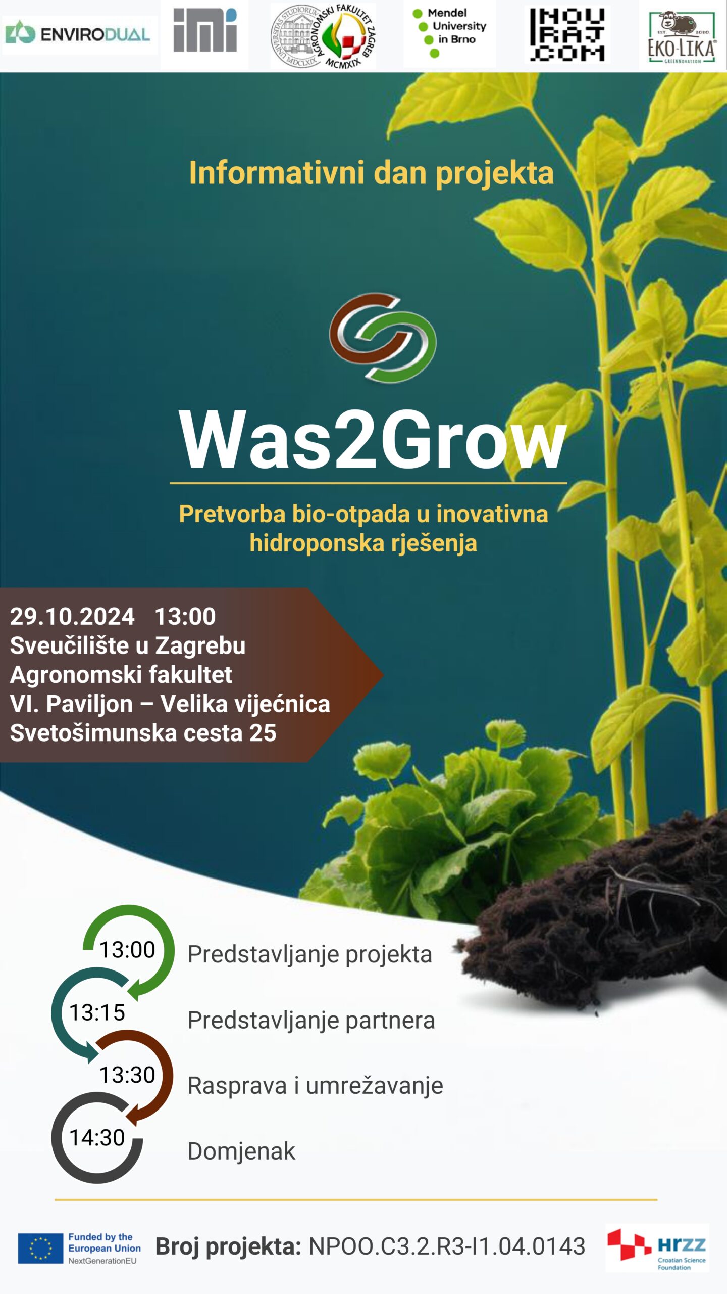 Sveučilište u Zagrebu Agronomski fakultet, u sklopu projekta „Pretvorba bio-otpada u inovativna hidroponska rješenja“, organizira Informativni dan koji će se održati 29. listopada 2024. godine na Agronomskom fakultetu, VI. paviljon – Velika vijećnica, Svetošimunska cesta 25.